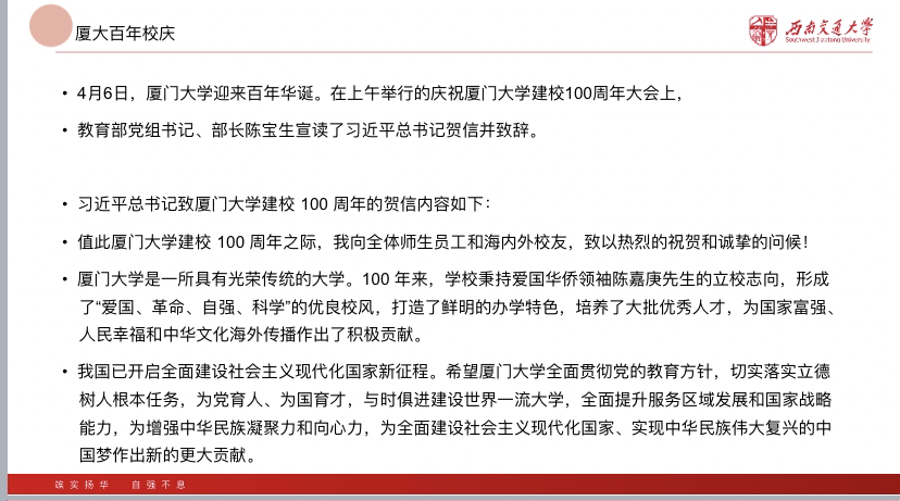 在学习习近平致厦门大学建校100周年的贺信精神方面,会议指出习近平总书记的贺信充分肯定厦大百年来的办学成就,对学校未来发展給予殷切期望、提出明确要求,为学校在新起点上实现高质量发展指明了前进方向、提供了根本遵循。他就学校深入学习贯彻习近平总书记贺信精神提三点要求。一、是坚定方向,扎根中国大地办大学。二、是坚守初心,落实立德树人根本任务。三、是勇担使命,增强服务创新发展的能力。