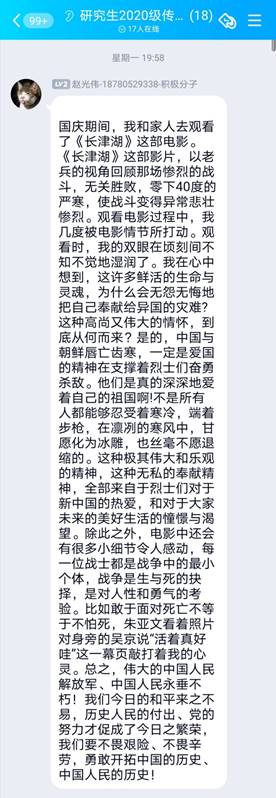 组织各支部一同观看以抗美援朝战争中长津湖战役为背景拍摄的电影《长津湖》。研究生2020级传播哲学党支部积极响应,组织支部内党员、发展对象以及积极分子参与此次活动。