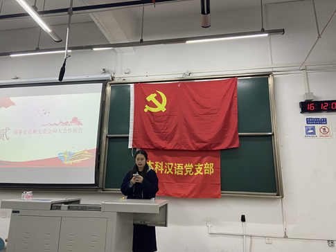 2021年12月17日下午4:00,本科汉语党支部于X2218教室召开2021-2022学年第二次党员大会暨支部年度总结大会。本次会议共有三项议题:1、讨论并表决六位预备党员转正申请;2、选举本届支委会;3、进行支部年度总结。本次支部大会由本科汉语党支部书记刘晗悦主持,大会现场内纪律良好,党员及入党积极分子全体参会。