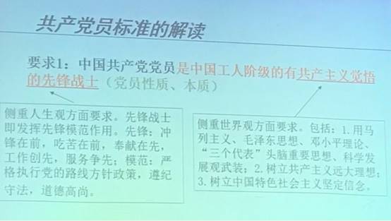 其次,在党员的基本标准方面,胡红老师就党章的具体规定进行解读,明确党员要全心全意为人民服务,这是党一贯坚持的根本立场和根本宗旨,是党员根本价值的根本取向,是共产党员追求的永恒主题。入党是奉献的开始,当人民、国家的利益需要你做出牺牲时,党员必须放弃个人私利,这是党员应有的觉悟和担当。