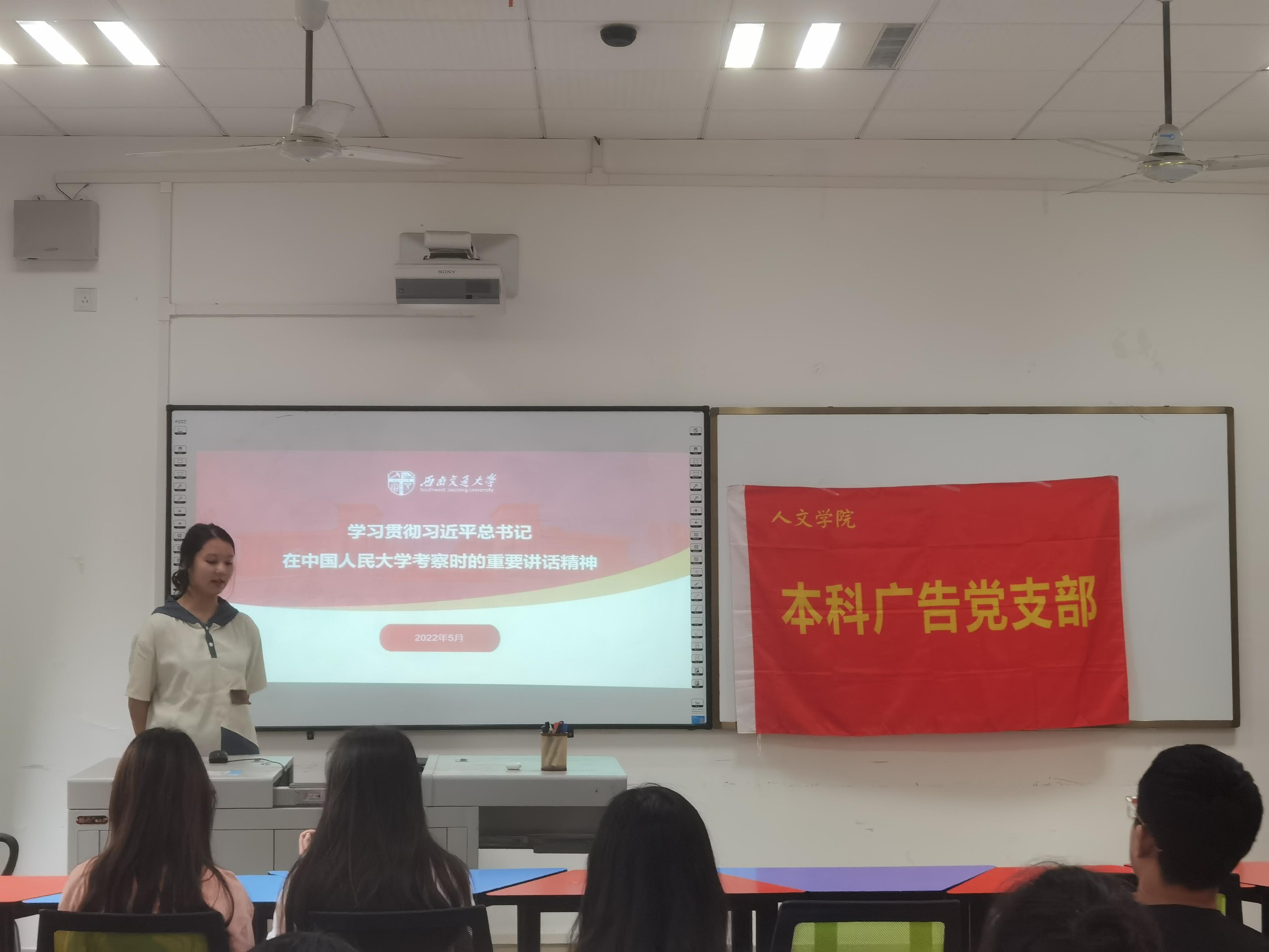 2022年5月12日16时,本科广告党支部于X4133开展了以“习近平总书记在中国人民大学考察时重要讲话精神”为主题的学习活动。本次活动由付林希同志领学,支部全体成员参加。