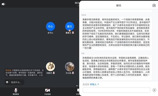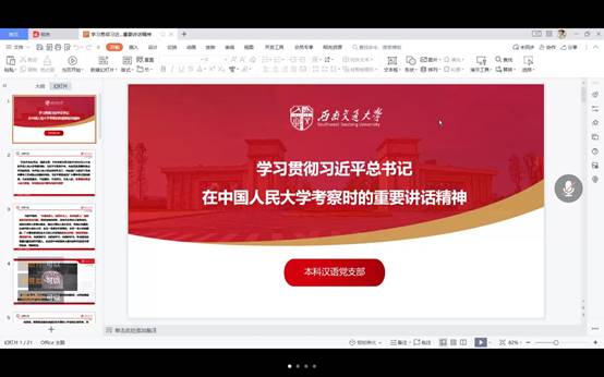 2022年5月19日下午3:50,本科汉语党支部依托腾讯会议App组织开展线上学习活动,学习内容分为两项,第一项为学习习近平总书记在中国人民大学考察时的重要讲话精神,第二项为学习习近平总书记在庆祝中国共产主义青年团成立100周年大会上的重要讲话精神。本次会议由王沁岚、冯琪祺同志主持,支部全体成员参与学习。