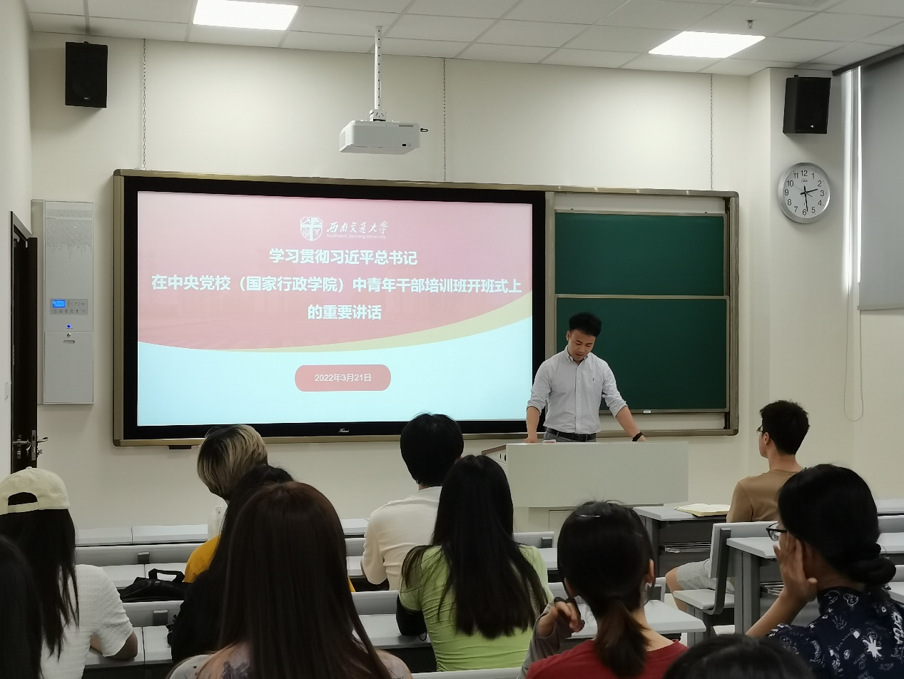 本科广告党支部于X30606教室举行了“学习贯彻习近平总书记在中央党校(国家行政学院)中青年干部培训班开班式上的重要讲话”专题党课学习活动。本次活动邀请到了学院党委副书记郭立昌同志主讲,支部全体成员参与学习。