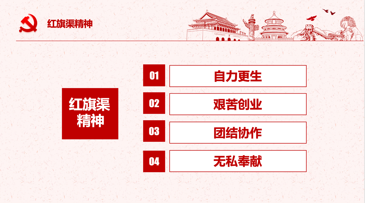 本次学习活动首先对红旗渠精神进行了学习。会议上,王超通过图片、视频讲解的方式,向大家展示了红旗渠的修建过程。20世纪60年代,为改善恶劣生产生活条件,摆脱水源匮乏状况,河南省林县人民在太行山的悬崖峭壁上修建了举世闻名的大型水利灌溉工程——红旗渠,培育形成了“自力更生、艰苦创业、团结协作、无私奉献”的红旗渠精神。在新时代新征程中,红旗渠精神依然是鼓舞我们艰苦奋斗、开拓进取的强大精神动力,依然是激励我们求真务实、真抓实干的宝贵精神财富。