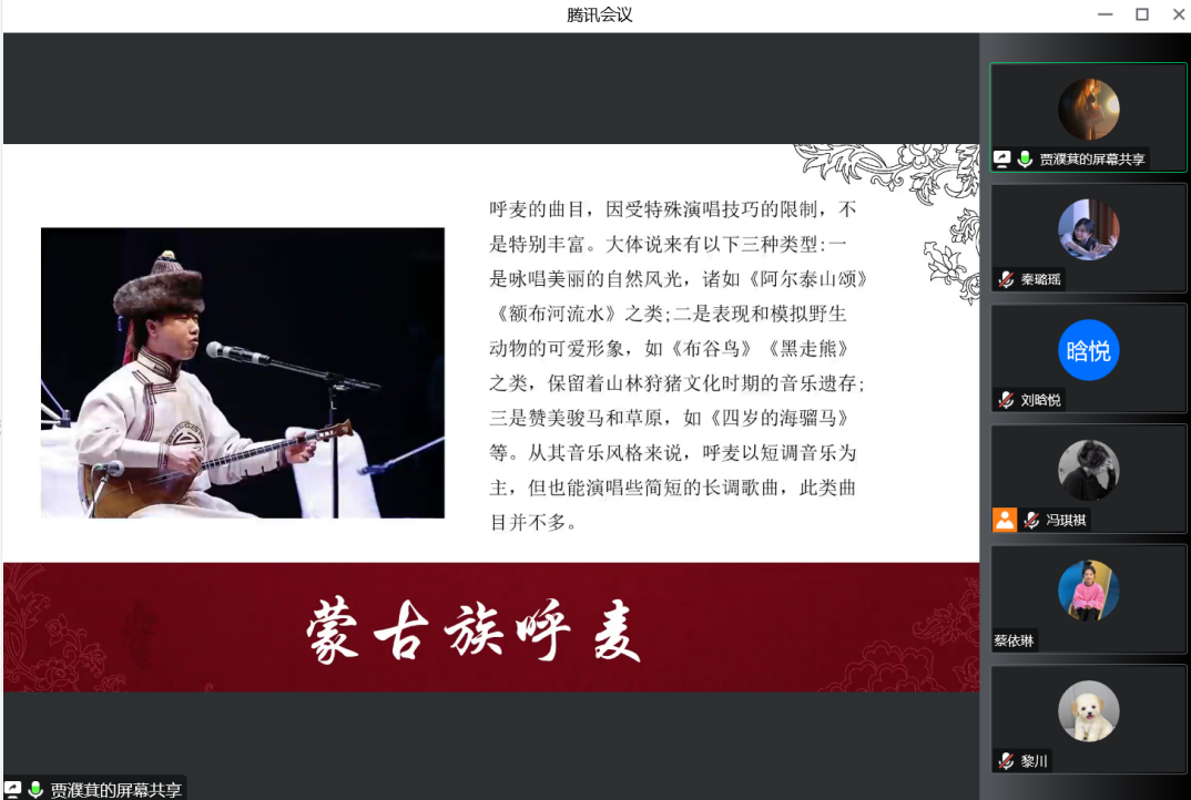 第一部分为贾濮萁同志向大家介绍非物质文化遗产的概念及特点。贾濮萁同志指出,非物质文化遗产世代相传,在各社区和群体适应周围环境以及与自然和历史的互动中,被不断地再创造,为社区和群众提供持续的认同感。随后,她结合例子介绍了中国非物质文化遗产的划分及涵盖范围。最后,贾濮萁同志结合家乡特色为大家介绍了蒙古族呼麦,并通过播放呼麦演唱现场的视频,带领大家感受到了草原旺盛的生命力和其独特的艺术魅力。