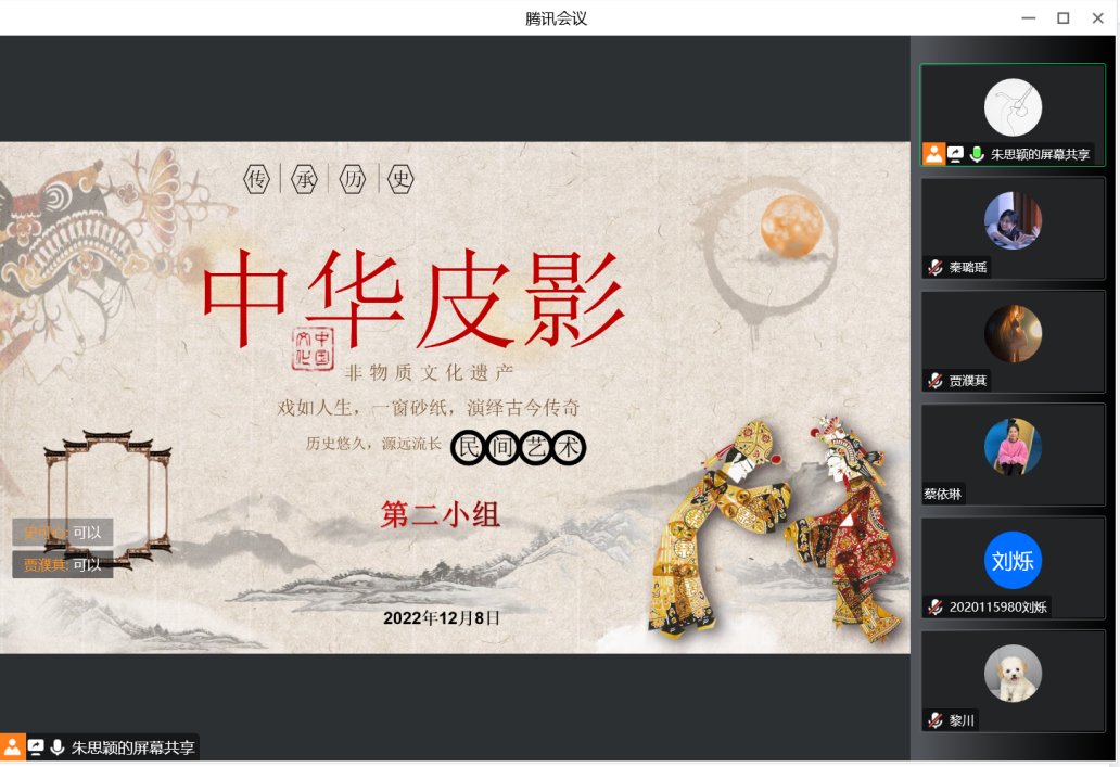 朱思颖同志为大家介绍了“皮影戏”的历史起源、表演形式、艺术源流、艺术特色,详细讲解了海宁皮影戏、陆丰皮影戏这两大流派,给大家带来了美的享受。她还结合亲身经历,分享了自己观看体验,呼吁大家去观看、体验皮影戏,亲身体验非物质文化遗产带来的震撼。陈劲骁同志通过一首歌谣带大家走近“剪纸”艺术,随后,详细介绍了剪纸的历史沿革、实用价值、特色剪纸。陈渝同志则从茶艺历史、家乡特色茶艺、茶艺文化三个部分为大家介绍了“茶艺”,带大家了解中国传统制茶技艺及其相关习俗。整个交流过程中,各小组的分享精彩纷呈且各有侧重,支部成员更切实地感受到了多种非物质文化遗产的魅力,收获满满。