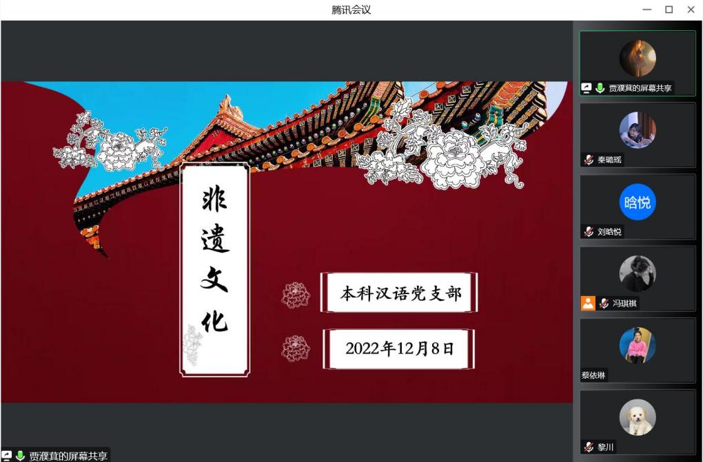 习近平总书记在党的二十大报告中提到,要不断加大文物和文化遗产的保护力度,坚守中华文化立场,提炼展示中华文明的精神标识和文化精髓。为了更好地领会习近平总书记的重要讲话,从精神层面认同非物质文化遗产,寻找我们民族赖以生存的精神之根,本科汉语党支部于2022年12月8日下午15:50分,在线上开展了支部特色活动之家乡非遗文化专题学习分享。本次活动有两项安排:一是贾濮萁同志领学,向大家介绍非物质文化遗产的概念及特点,二是由支部成员轮流分享,结合家乡特色进行展示。木瓜视频