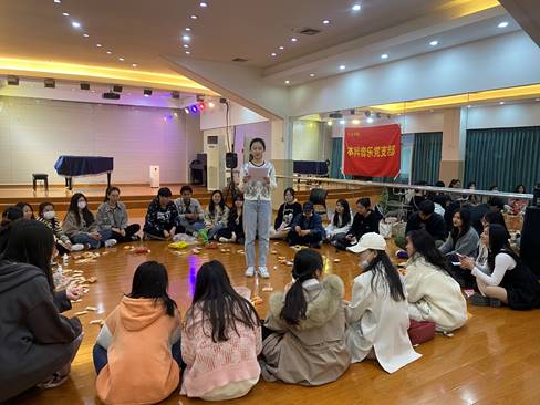 本科音乐党支部在音乐系舞蹈教室开展学习生活经验交流座谈会,本次座谈会邀请了大四的学长学姐进行经验分享,由王姣扬同志主持。