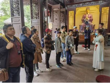 上午10点,教师党员和学生代表一行首先来到眉山市三苏祠。三苏祠是北宋著名文学家苏洵、苏轼、苏辙三父子的故居,也是千百年来历代文人雅士拜谒、凭吊三苏的文化圣地。“三苏”文化博大精深、底蕴深厚,不仅是巴蜀文化的宝贵遗产,更是中华优秀传统文化的重要组成。2018年,联合国教科文组织曾授予三苏祠“文化遗产保护荣誉证书”,称其“为中华文化在世界范围内的传播做出了巨大贡献”。