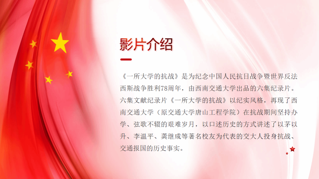 (原交通大学唐山工程学院)在抗战期间坚持办学、弦歌不辍的艰难岁月,讲述了以茅以升、李温平、龚继成等著名校友为代表的交大人投身抗战、交通报国的历史事实。这些工程在当时打破了日寇的封锁,保证了国际援助大动脉的畅通,为抗日战争的最后胜利创造了条件。