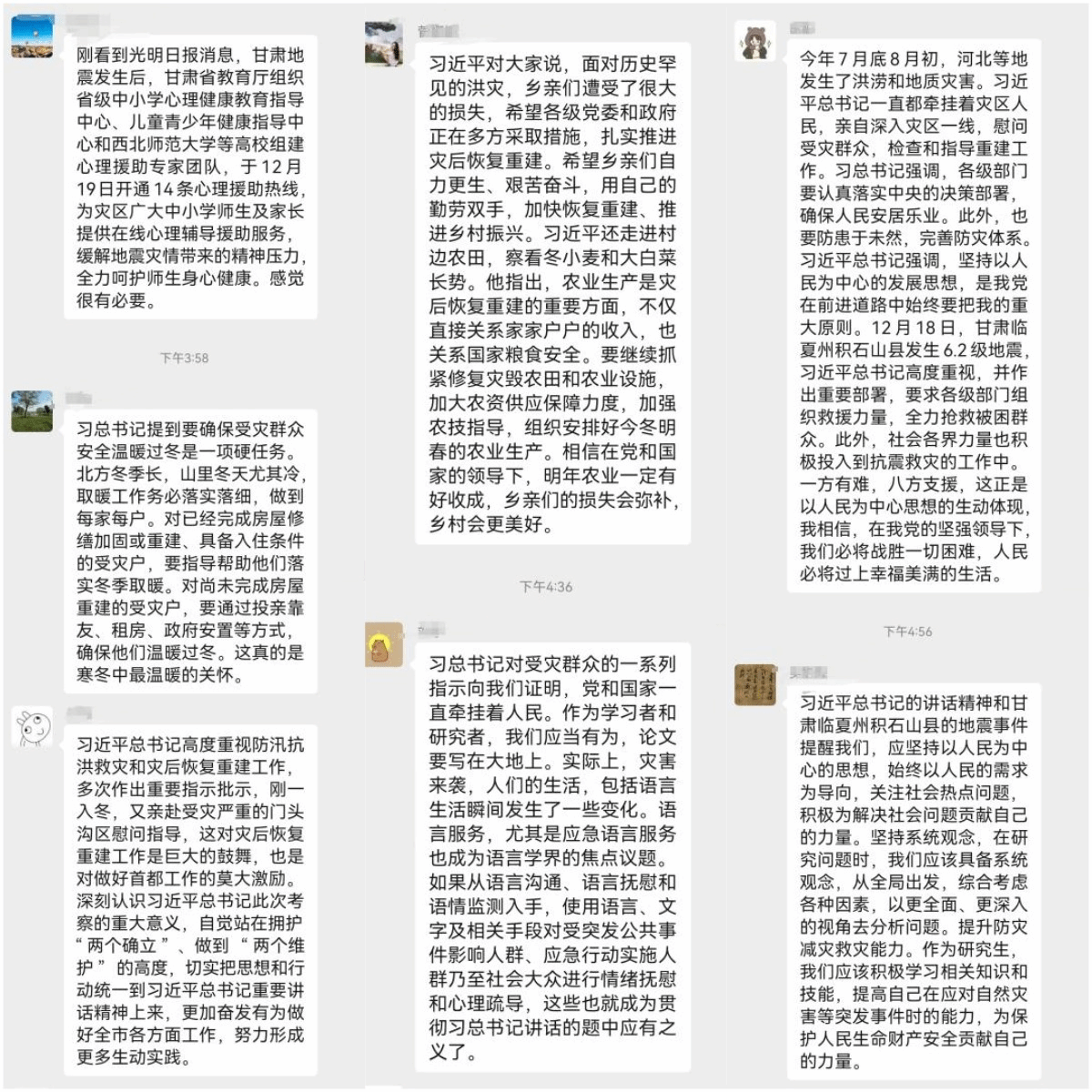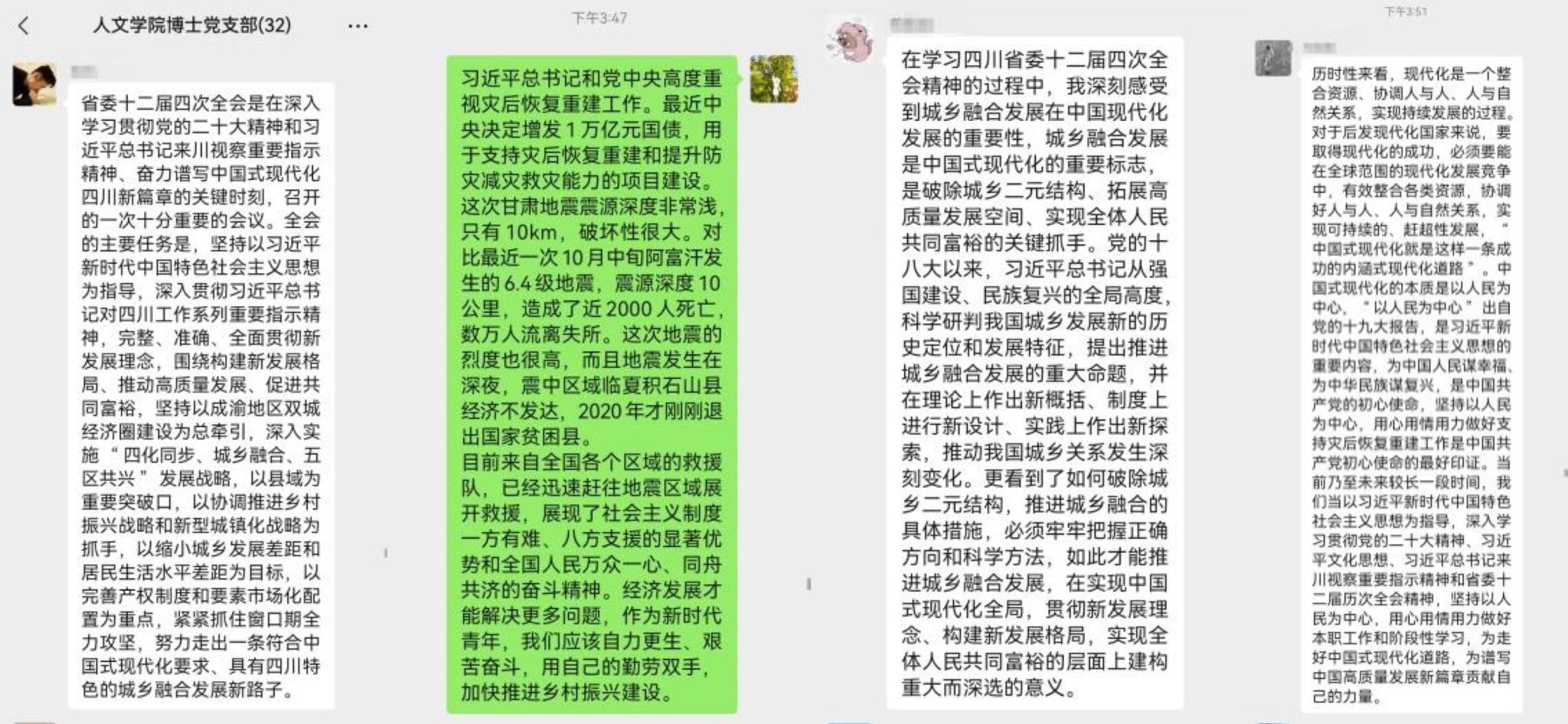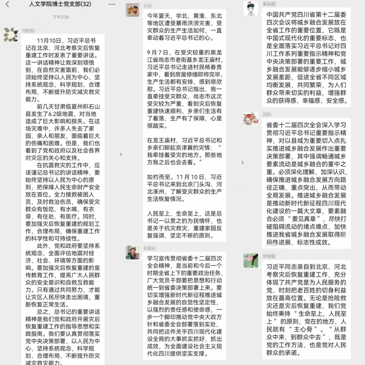 博士党支部在微信群召开专题学习会。本次会议由党支部副书记冯轩羽同志组织领学,学习包括三个专题:学习贯彻四川省委十二届四次全会精神,学习《中国共产党发展党员工作细则》,学习贯彻习近平总书记在北京、河北考察灾后恢复重建工作时的重要讲话精神。