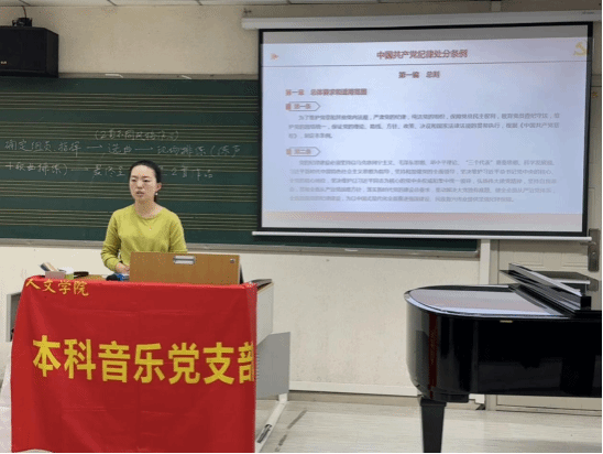 本科音乐党支部在音乐系音专一教室开展党纪学习教育动员会暨“学条例 守党纪 强党性”主题党日活动,支部全体成员参会。