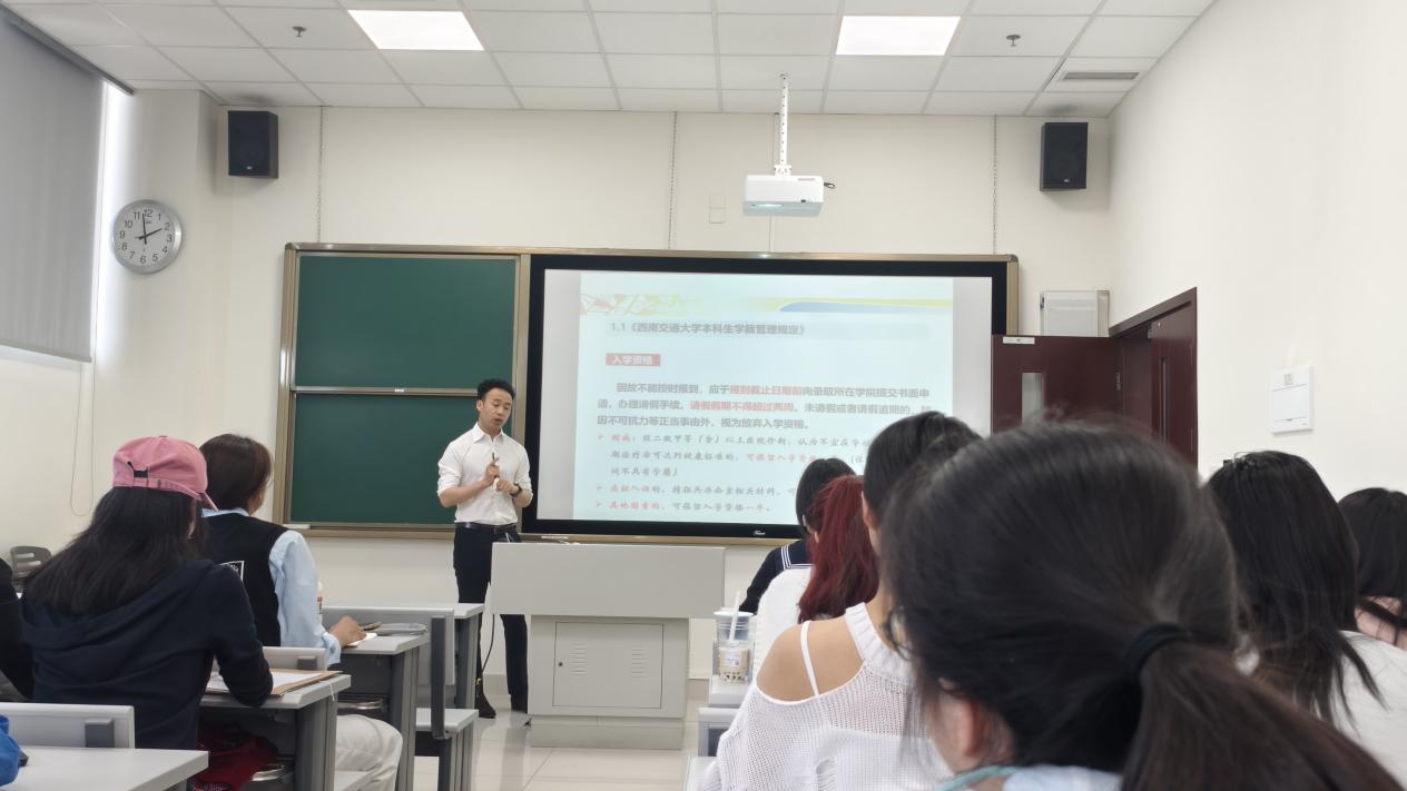 本科生学籍管理规定》、国家安全教育和大学生法制教育三个方面讲述了作为交大本科生应遵守的规章制度,作为新时代青年应该遵守的法律法规,让同学们领悟不仅要将法律法规铭记于心,更要做到知行合一。