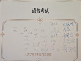 在活动第三部分,支部全体成员庄严签署诚信考试承诺书,通过仪式化教育强化纪律意识与诚信理念,为营造风清气正的考试环境筑牢思想根基,推动形成以诚信为本、以实力取胜的良好学风,让严肃考纪、文明应考成为每一位成员的共同行动准则。