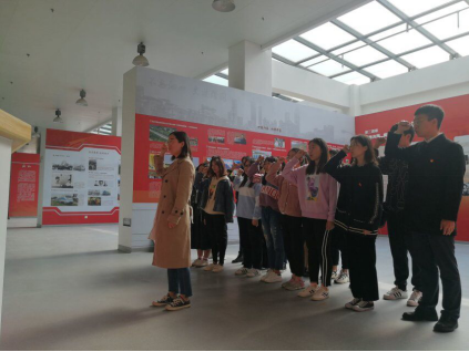 在70周年成果展的展厅,刘明月向大家介绍了交大师生在新中国成立七十年来所取得的卓越成就和作出的重要贡献,并带领支部同志高举右拳,面向党旗,庄严宣誓,重温入党誓词。