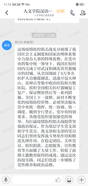 支部副书记杨盛果同志强调,这次疫情防控阻击战展现了中国特色社会主义制度和国家治理体系集中力量办大事的特殊优势,正是在党中央的集中领导下,才能够短时间内解决物资供应等一系列问题。他同时对支部成员在志愿服务、组织捐款以及宣传教育等方面的工作给予肯定。徐舟雨同志结合自己在老家做志愿者期间的所见所闻来谈自己的感受,他认为党员要勇于担当,发挥一不怕苦二不怕累的精神,才能打赢这场疫情防控阻击战,无愧于党员身份。
