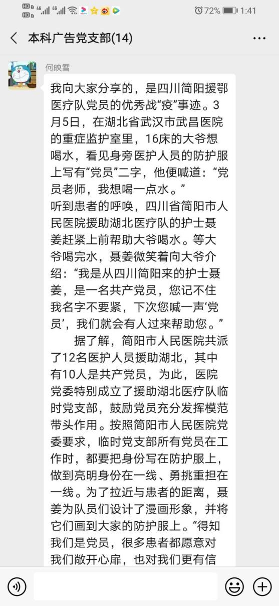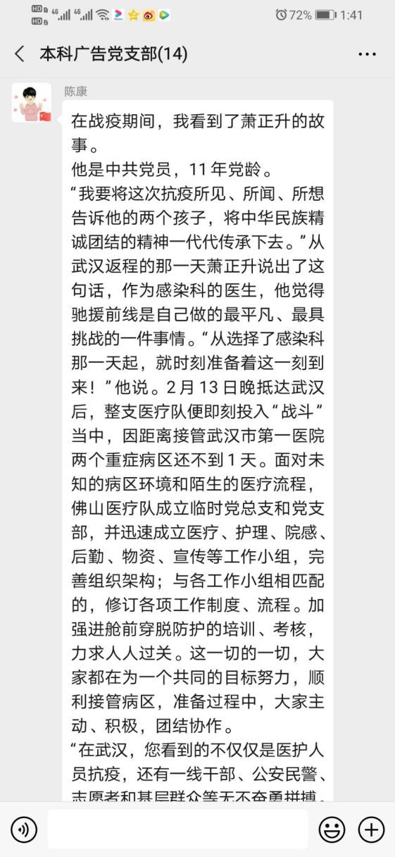 本科广告党支部在线上开展“学习榜样守初心,主动作为担使命”专题党日活动。活动主要内容为疫情期间,我们发现身边抗疫的榜样人物和先进事迹,学习交流他们身上的担当与光辉,激励自己履行责任与使命。本次活动由支部副书记徐丹同志主持。