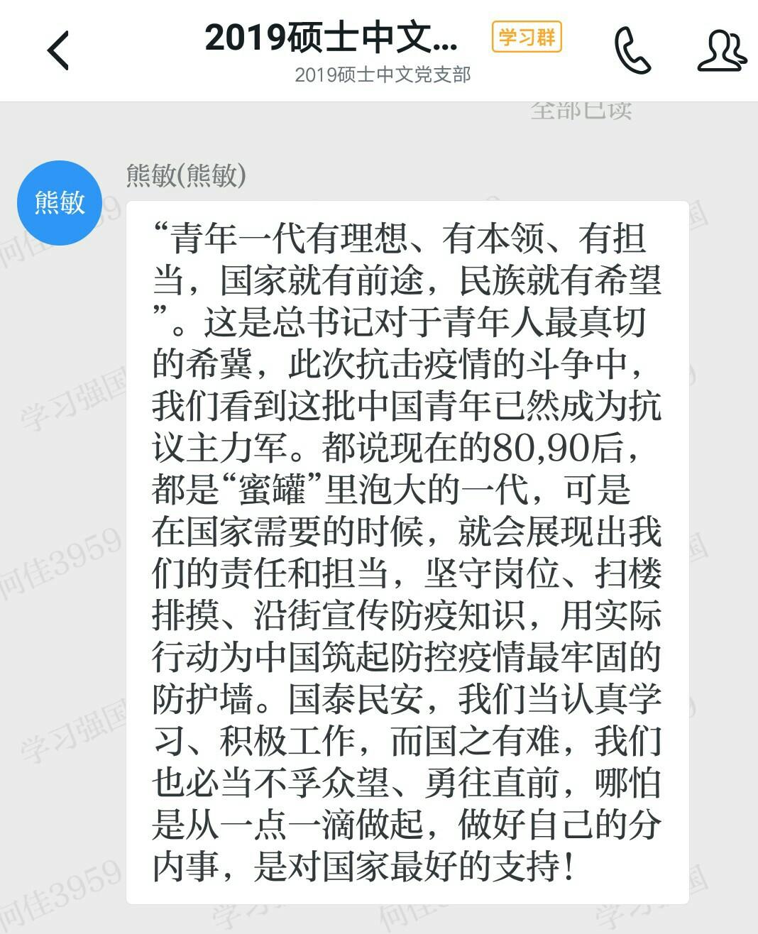 2020年4月30日下午15:00,2019级硕士中文党支部在学习强国平台开展学习习近平总书记重要回信精神主题党日活动。