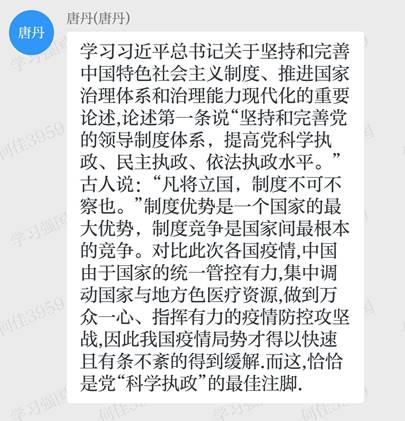 首先党支部书记何佳同志带领全体党员学习《中共中央关于坚持和完善中国特色社会主义制度、推进国家治理体系和治理能力现代化若干重大问题的决定》,并辅之以习近平总书记10句重要讲话来深入学习和贯彻《决定》的精神。唐丹同志表示在此次疫情防控战中更为深刻地感受了中国特色社会主义制度的优越性