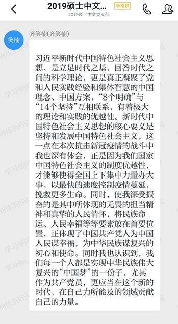 2020521日下午15:00点,2019级硕士中文党支部在学习强国平台开展主题党日活动。