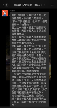 观影结束后,支部内同志们纷纷发表观影感言。张靓怡同志说道:“在新时代我们更有必要牢记历史、坚定民族自信。我们更应当珍惜当今来之不易的幸福和稳定生活,并更好地继承和发扬人民志愿军的精神,在遇到困难和挫折时,不畏难不怕难,越是困难越要上,为祖国的繁荣和安稳贡献一份力量。”