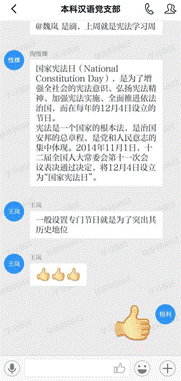 之后,在王岚同志的引导下,支部同志就党规党纪和国家法律作出区分。在阅读资料的基础上,各位同志结合自己的理解认真发言。郭梦旸等同志讨论了二者的关系,党内法规与国家法律并行不悖、相互联系;但二者之间又有区别,国法高于党纪,国法强化党纪效能,而党的先锋队性质和先进性要求又决定了,党规严于国法,国法是所有公民的行为底线,党纪是对党组织和党员立的规矩。陈萌萌同志以“对腐败分子的惩治”,阐释了党纪与国法的辩证关系。此外,支部以互动发言的形式对“中国特色社会主义法治的核心要求和涵义”等问题进行了学习,重点了解了中国特色社会主义法治道路核心要义的三个方面:一是坚持党的领导,二是坚持中国特色社会主义制度,三是贯彻中国特色社会主义法治理论。