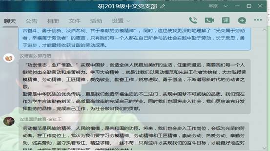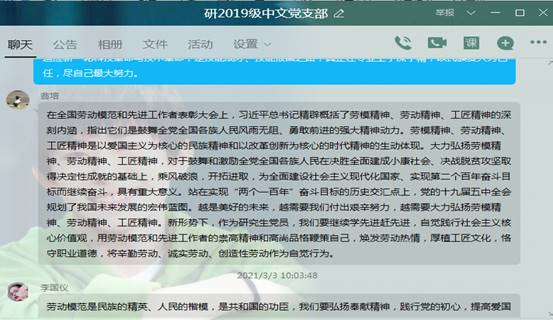 2021年3月3日早上10点,研2019级中文党支部线上开展“学习习近平总书记在全国劳动模范和先进工作者表彰大会上的讲话精神”主题学习会,会议由李沅忆同志主持。习近平总书记在会议上充分肯定了我国工人阶级和广大劳动群众为建设中国特色社会主义伟大事业作出的巨大贡献,强调在全面建设社会主义现代化国家新征程上,要大力弘扬劳模精神、劳动精神、工匠精神,努力建设高素质劳动大军,切实实现好、维护好、发展好劳动者合法权益,并对新时代坚持全心全意依靠工人阶级方针、加强和改进党对工会工作的领导、支持工会组织在党和国家工作大局中发挥作用提出了明确要求。