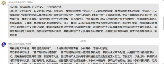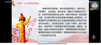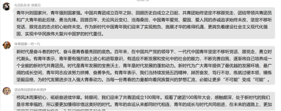 在观看完中国共产主义青年团成立100周年大会,学习了习近平总书记的讲话后,同学们备受鼓舞,反响热烈,表达了做新时代的奋斗者、五四精神的传承者的决心。青年是整个社会力量中最积极、最有生气的力量,祖国的未来属于青年,重视青年就是重视未来,青年工作攸关党和国家的前途命运。我们青年应该不负韶华,向前奋斗,为社会,为祖国奉献自己的力量。