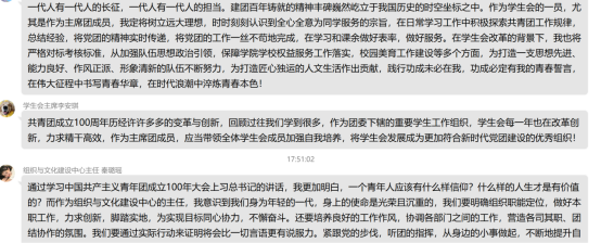 一代人有一代人的长征,一代人有一代人的担当。建团百年铸就的精神丰碑巍然屹立于我国历史的时空坐标之中。作为学生会的一员,尤其是作为主席团成员,我定将树立远大理想,时时刻刻认识到全心全意为同学服务的宗旨,在日常学习工作中积极探索共青团工作规律,总结经验,将党团的精神实时传递,将党团的工作一丝不苟地完成,在学习和课余做好表率,做好服务。在学生会改革的背景下,我也将严格对标考核标准,从加强队伍思想政治引领,保障学院学校权益服务工作落实,校园美育工作建设等多个方面,为打造一支思想先进、能力良好、作风正派、形象清新的队伍不断努力,为打造匠心独运的人文生活作出贡献,践行功成未必在我,功成必定有我的青春誓言,在伟大征程中书写青春华章,在时代浪潮中淬炼青春本色!