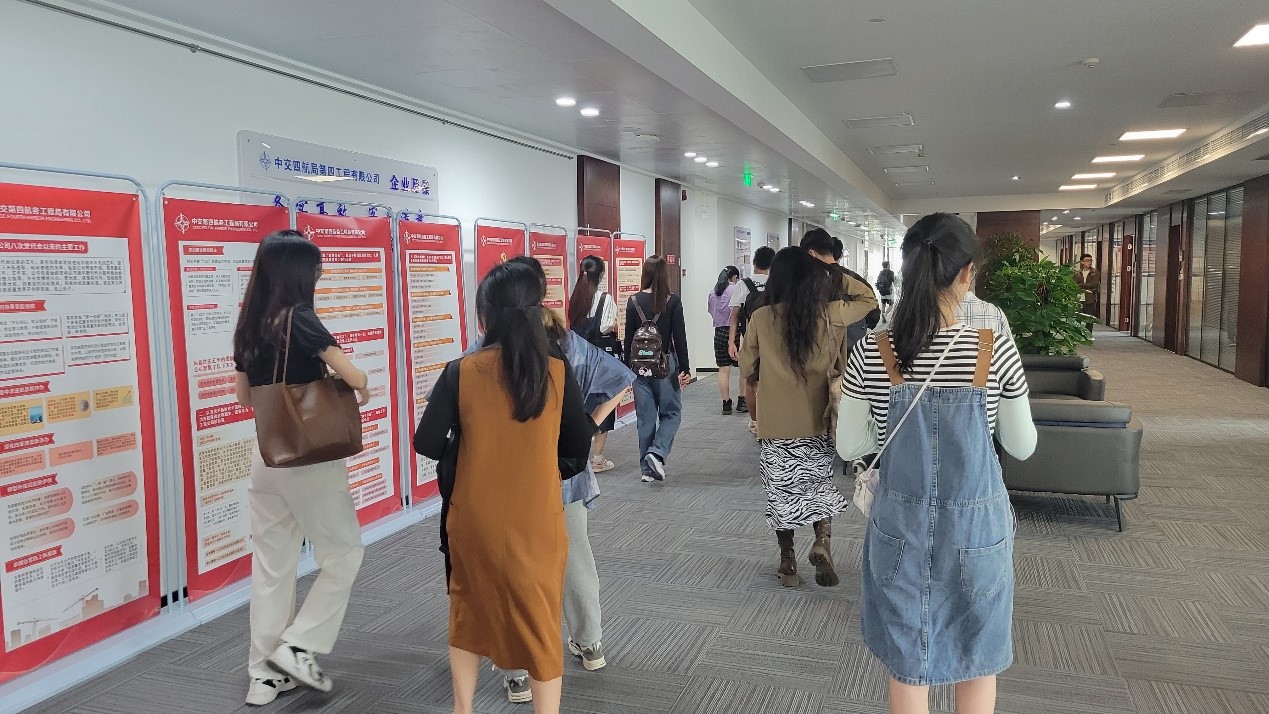 中交四航局第四工程有限公司位于成都市天府新区,聚焦大交通、大城市,深耕细作成渝双城经济圈,是全球领先的交通基础设施投资建设运营企业。19日下午2时30分,就业训练营一行人到达中交国际中心大楼,中交四航局四公司人力资源部负责人邹小宁热情地接待了同学们。邹小宁带领训练营的同学们首先参观了四公司的办公区,一一为同学们介绍了党员活动室、职工书屋、劳模创新工作室、妈咪宝贝屋等办公区建设,让同学们了解到了四公司丰富的职工群众文化生活。随后,就业营的同学们进行了自由参观,在中交四航局四公司的展板上,同学们认真浏览四公司的公司简介、全球布局、发展目标,加深了对四公司的认识。