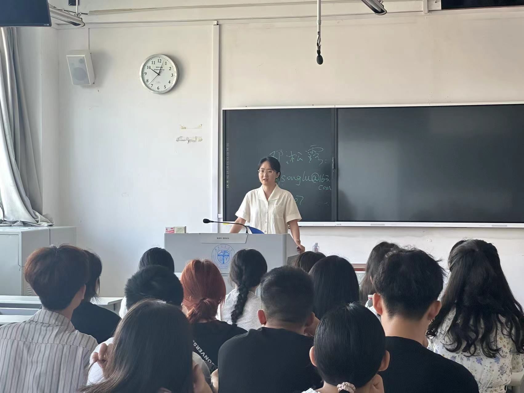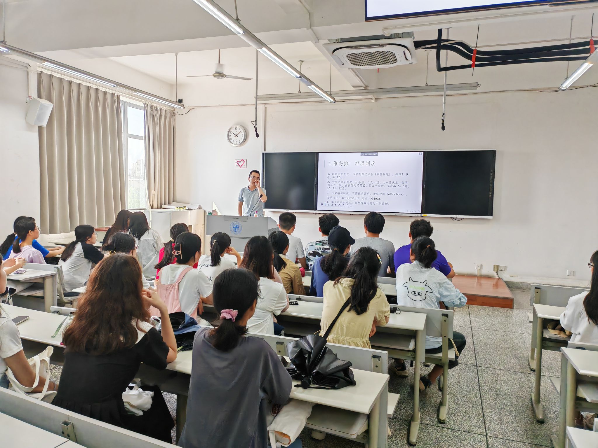 新闻传播学专业见面会在X8523、X8524教室举行。新传一、二班班导师张镭、梅红出席见面会,两位老师首先对同学们表示欢迎,并为大家介绍了我院新闻传播专业建设、师资力量等相关情况。并希望大家摒弃对专业的前见,抱着期待重新认识新闻传播,并平衡价值理性和工具理性,找到合适的学习目标。