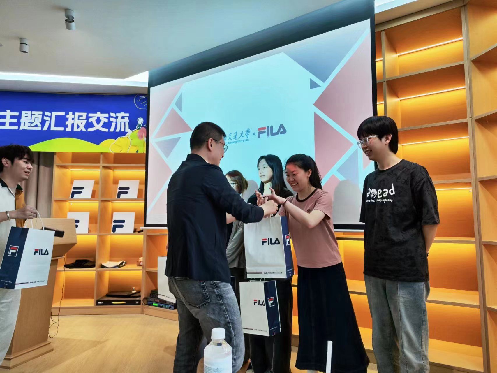 截止当日下午18:00,所有学生小组均完成了课题汇报,主持人随即汇总了所有小组的考核分数、统计出本次课程考核的前三名。FILA零售人力资源总监王壮先生为前三名的小组颁发了奖品。木瓜视频