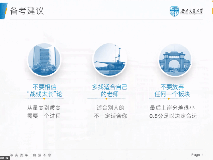 第三位分享的是来自2021级硕士传播哲学班的黄姗同学。她从时间规划、信息搜集、备考建议三个角度进行了分享。在时间规划上,黄姗同学建议尽早准备,尽量尽快完成毕业论文,避免与考试时间相撞。而在信息搜集上,黄姗同学建议大家多关注官网、公众号、备考群等,及时获取关键信息。