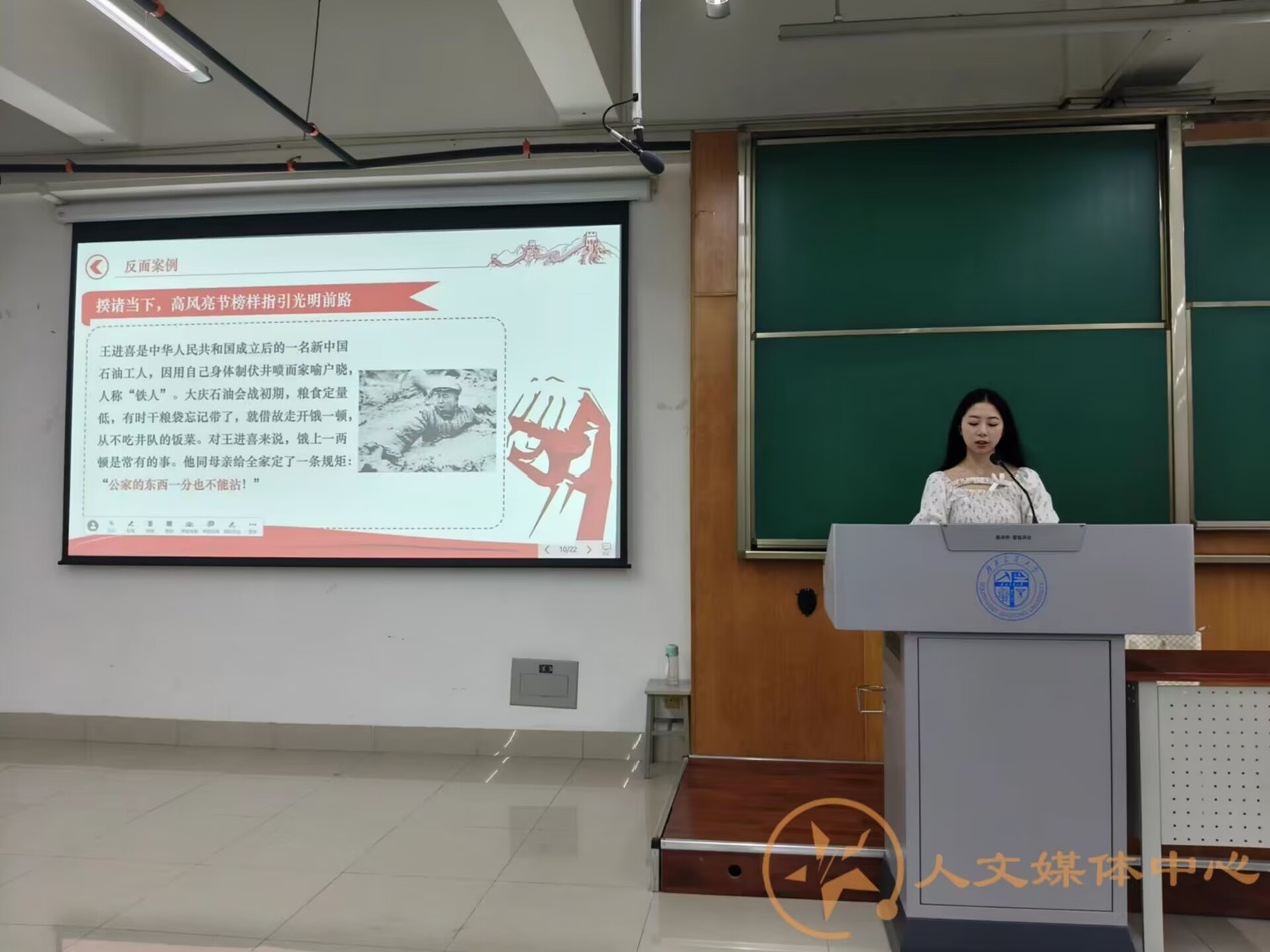 全面从严治党是新时代党的自我革命的伟大实践,是党的二十大提出的加强新时代党的建设的重大举措。曾品贤首先向同学们阐述了党风廉政建设的重要性,它直接影响着党执政能力的提高。不仅如此,腐败已经对党,国家和人民造成了巨大威胁。她指出,廉洁的理想信念是精神上的钙,对于政治,经济,道德和生活有重要影响。随后,她还通过列举清朝和珅贪污的反面案例,让大家明白贪污腐败对政治生态和社会经济的负面影响;并通过铁人王进喜,查玉昇,朱家壁,孔繁森等的正面典型,向呼吁同学们向高风亮节的榜样学习。