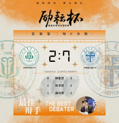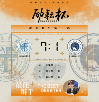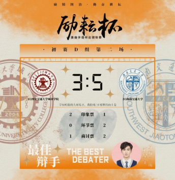 “励耘杯”西南华语辩论锦标赛是西南地区高规格华语辩论赛事,覆盖云、贵、川、渝、桂五省,共有来自四川大学、重庆大学、西南大学等24所高校报名参赛。在初赛中,我校队员力克西安交通大学城市学院和成都理工大学进入复赛,随后以7:2的比分战胜四川农业大学,与重庆大学会师半决赛。半决赛中,双方以“中国电影咖起更应该注重重塑传统IP/创造新IP”为话题进行了激烈辩论,最终以3:6惜败重庆大学,获得本次比赛季军。