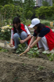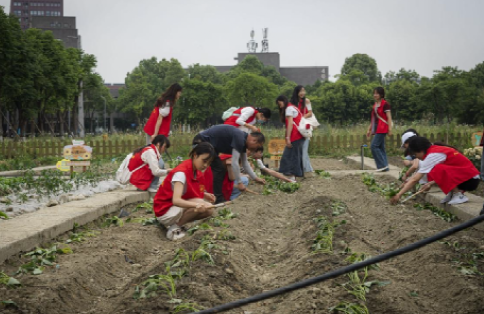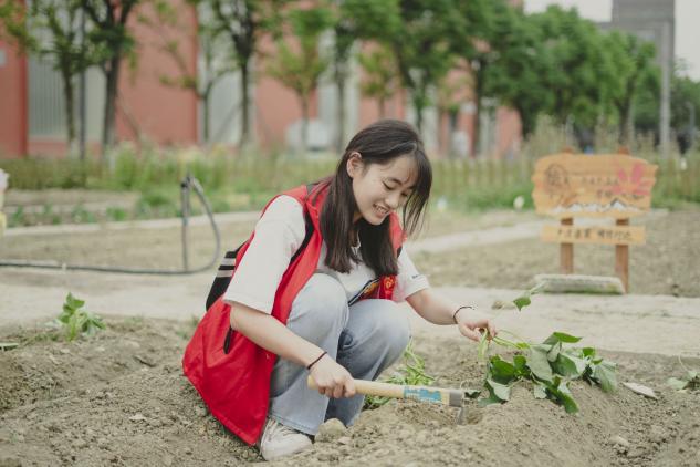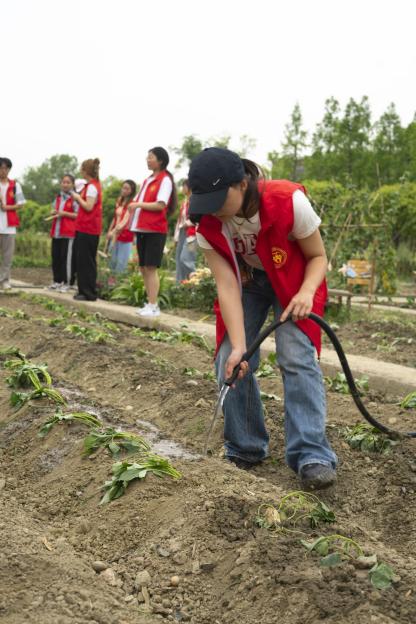 夕阳的余晖倾洒在农场,新翻的土壤散发着质朴的气息,与嫩绿的秧苗交织出蓬勃图景。同学们有序领到花生种子与红薯藤后,便投身于劳作之中。弯腰培土的专注身影与田垄间竖起的学院标识牌相映成趣。