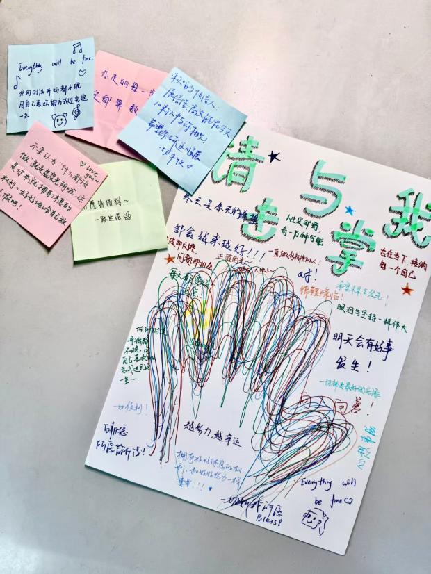“请与我击掌”环节则将自我鼓励与群体联结巧妙融合。一张印有“请与我击掌”的硬卡纸在活动室内传递,同学们在纸上重叠绘制手掌轮廓,并写下专属心愿与鼓励话语——“一直做有韧性的人”、“每天都要变好一点”、“越努力越幸运”等字句饱含力量,“种”出了一棵满溢温暖的“手掌树”,成为同学们自我认同与彼此支持的生动见证。