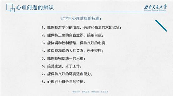 袁文林同学指出,大学生的心理健康问题日渐频发,作为心理委员,应该对心理问题具备一定的判别能力。他为大家列出了大学生心理健康的标准,可以用来大致判断同学的心理健康状况。