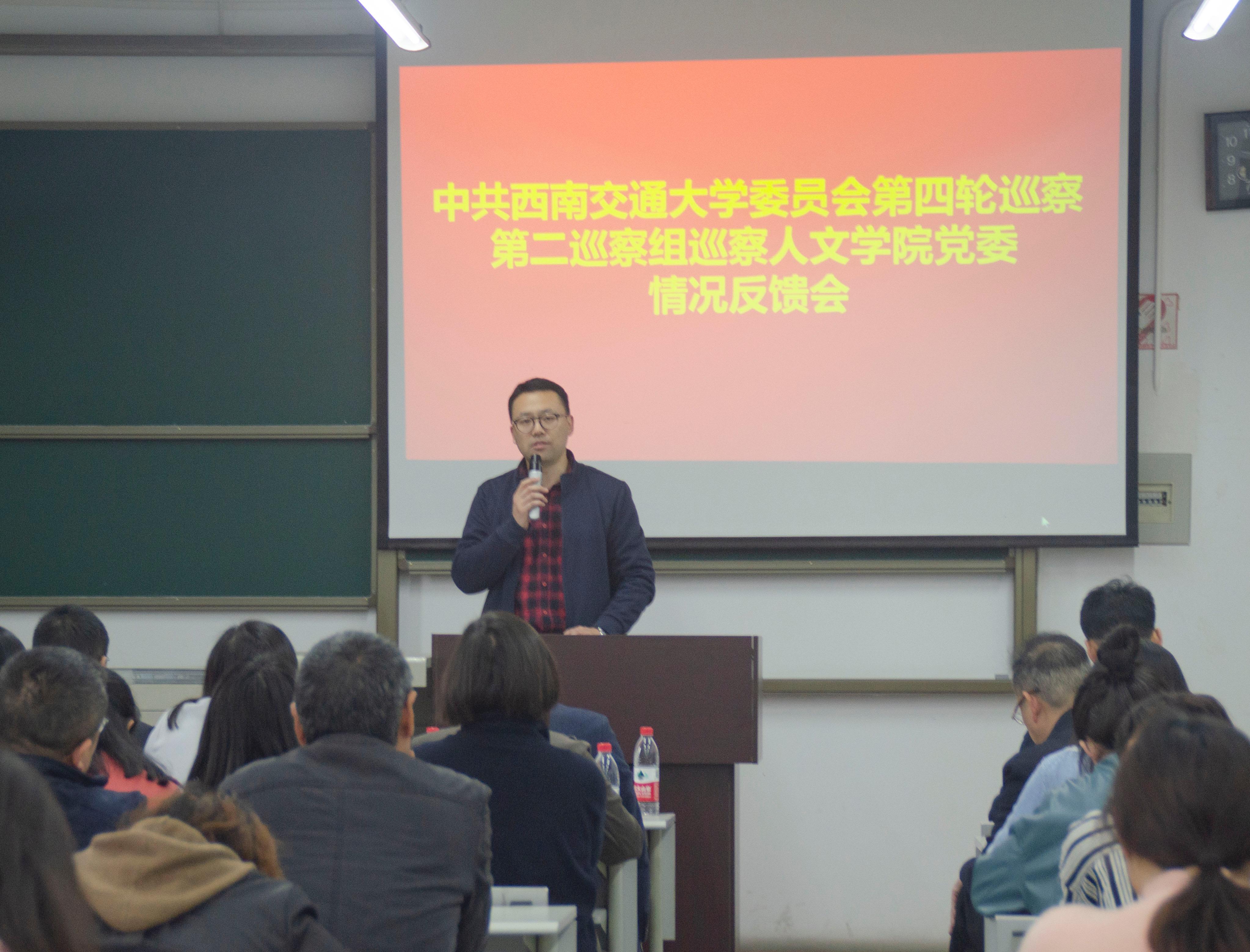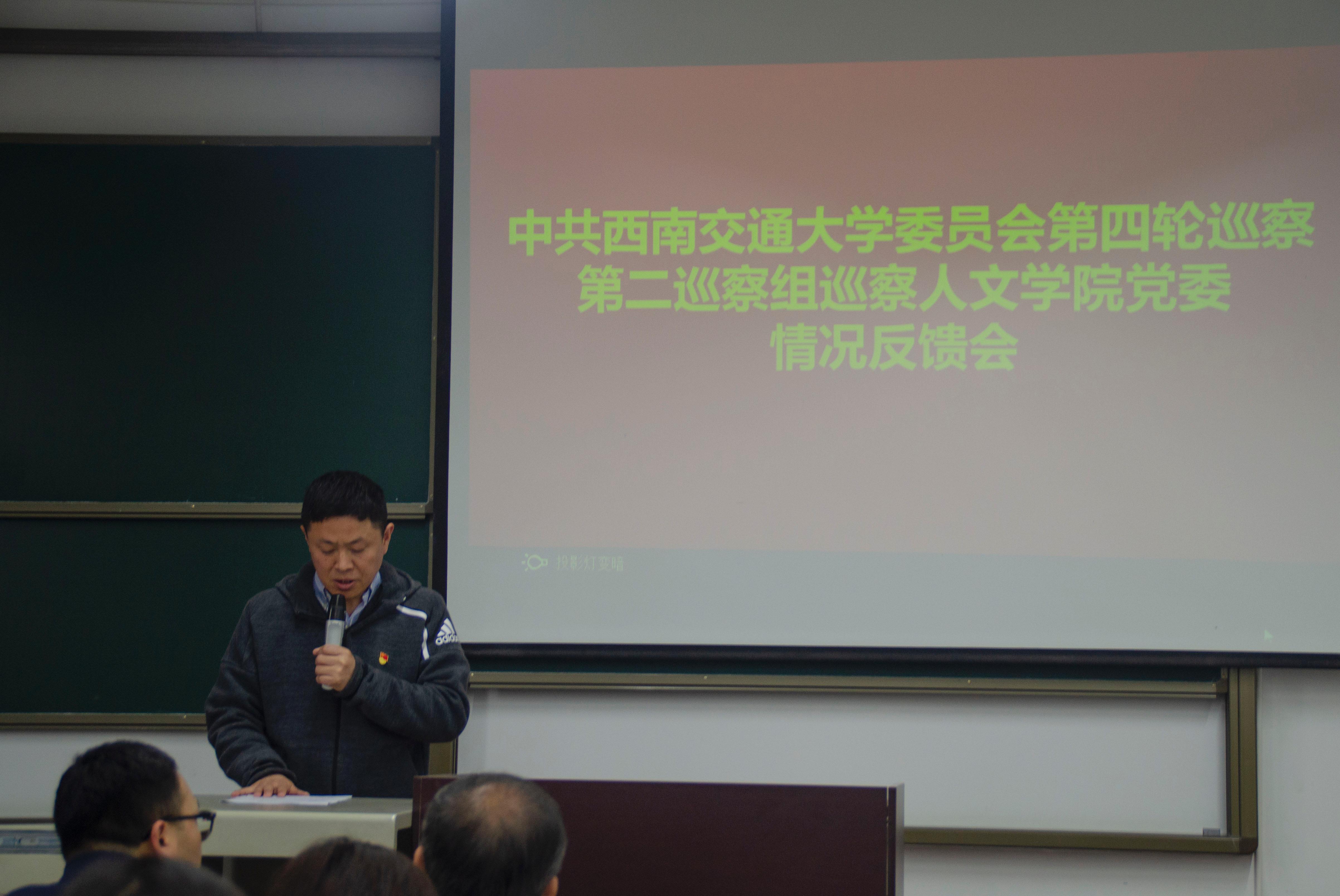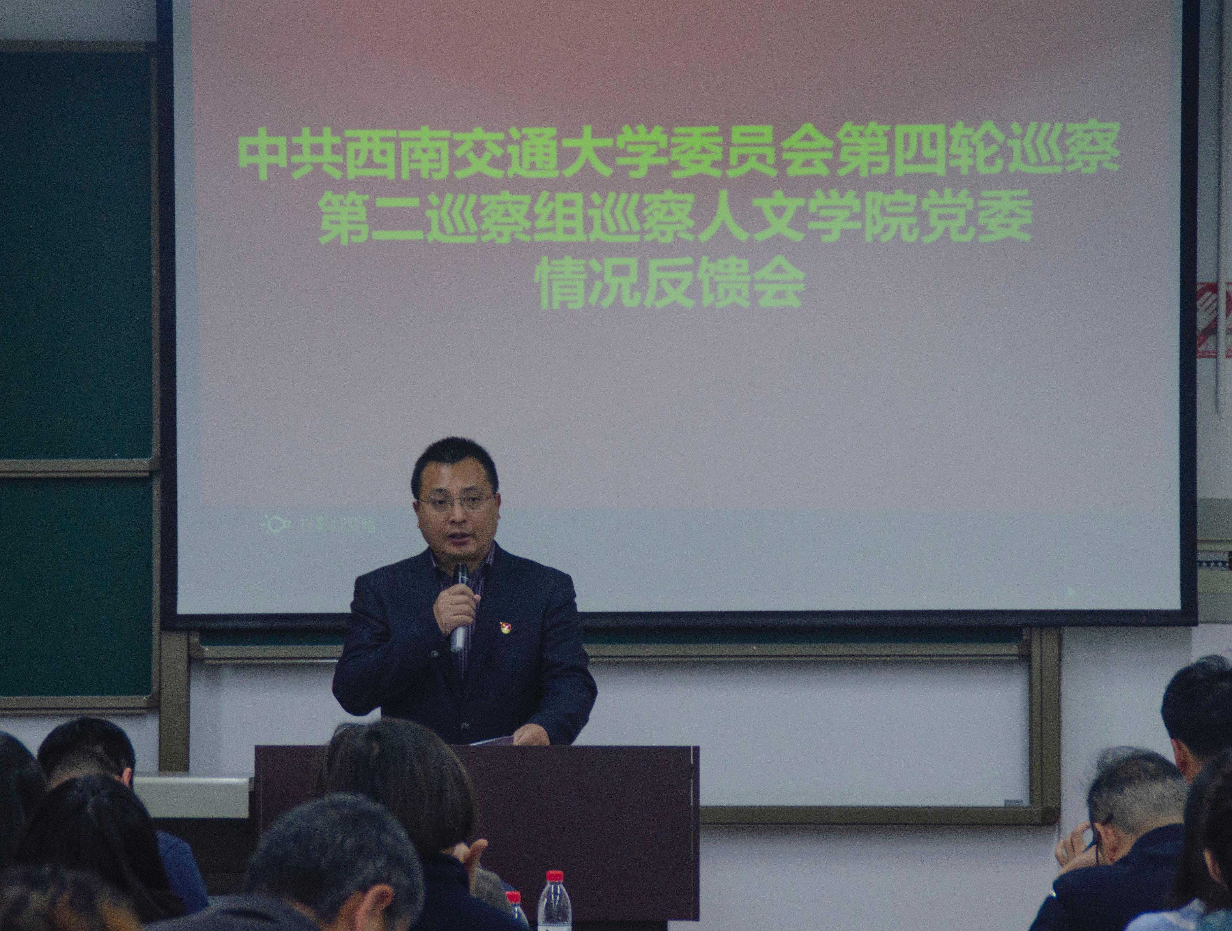 党委反馈巡察情况。校党委第四轮巡察第二巡察组组长贺剑代表巡察组分别向学院党政主要负责人、领导班子和干部群众反馈了巡察情况。联系学院的校党委副书记桂富强出席并做了讲话,并对学院整改工作进行了指导。学校纪委副书记兼监察处处长郝辽钢受校党委巡察工作领导小组委托出席了反馈会,纪检监察部门、党委组织部部门有关同志、党委第四轮巡察第二巡察组副组长郝建平出席了反馈会,学院党委书记向仲敏在反馈大会上作了表态发言,学院党委副书记郭立昌主持会议。