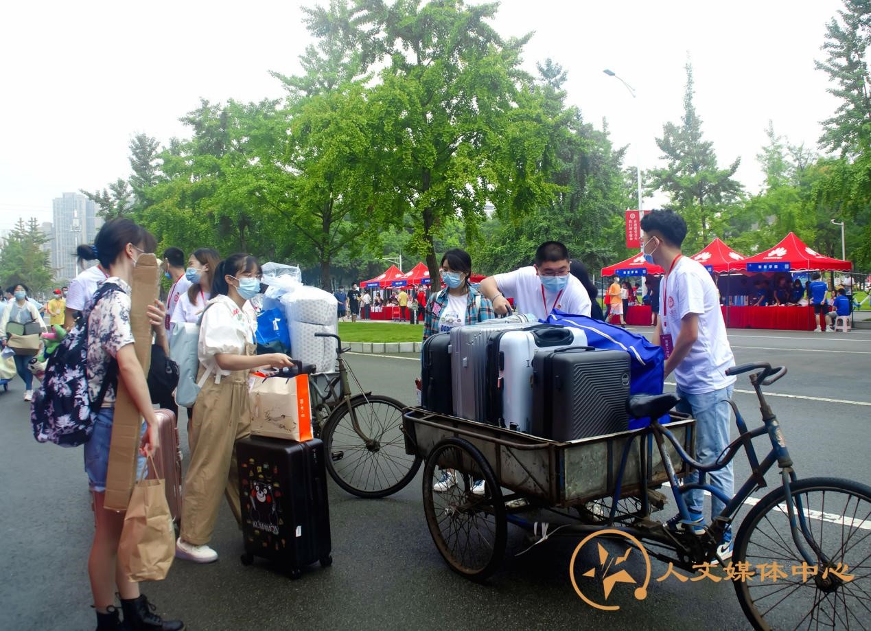 这个大家庭,这是所有迎新志愿者的初心。为了更好地迎接新同学,迎新工作者们借来了三轮车。新生班协姜骅峰同学和常鑫渝同学一趟一趟地搬运着新生的行李,给同学带去了很多便利。
