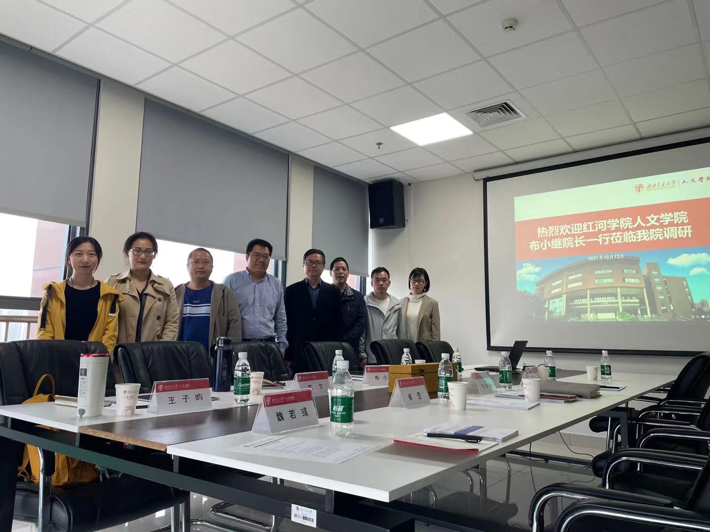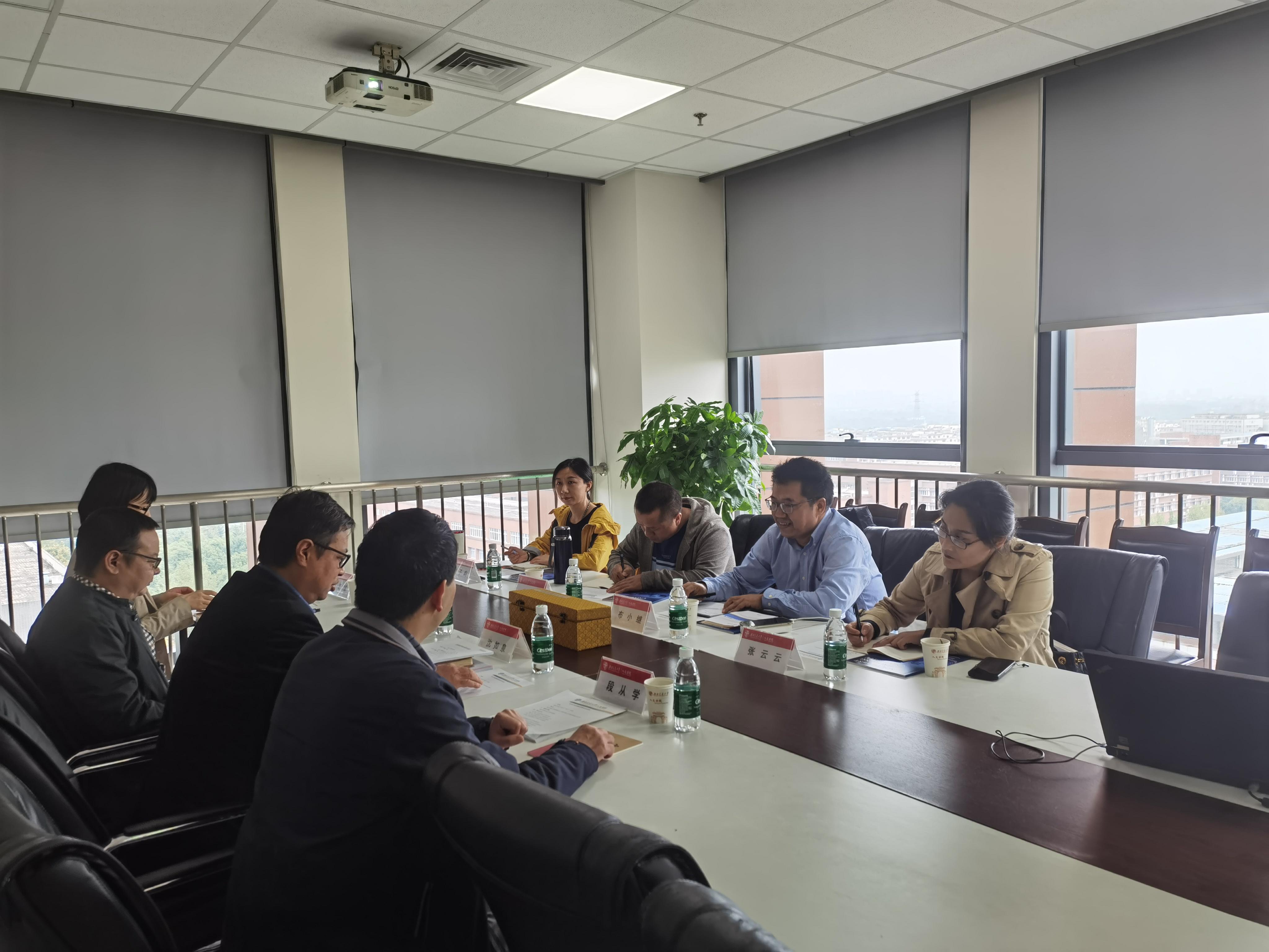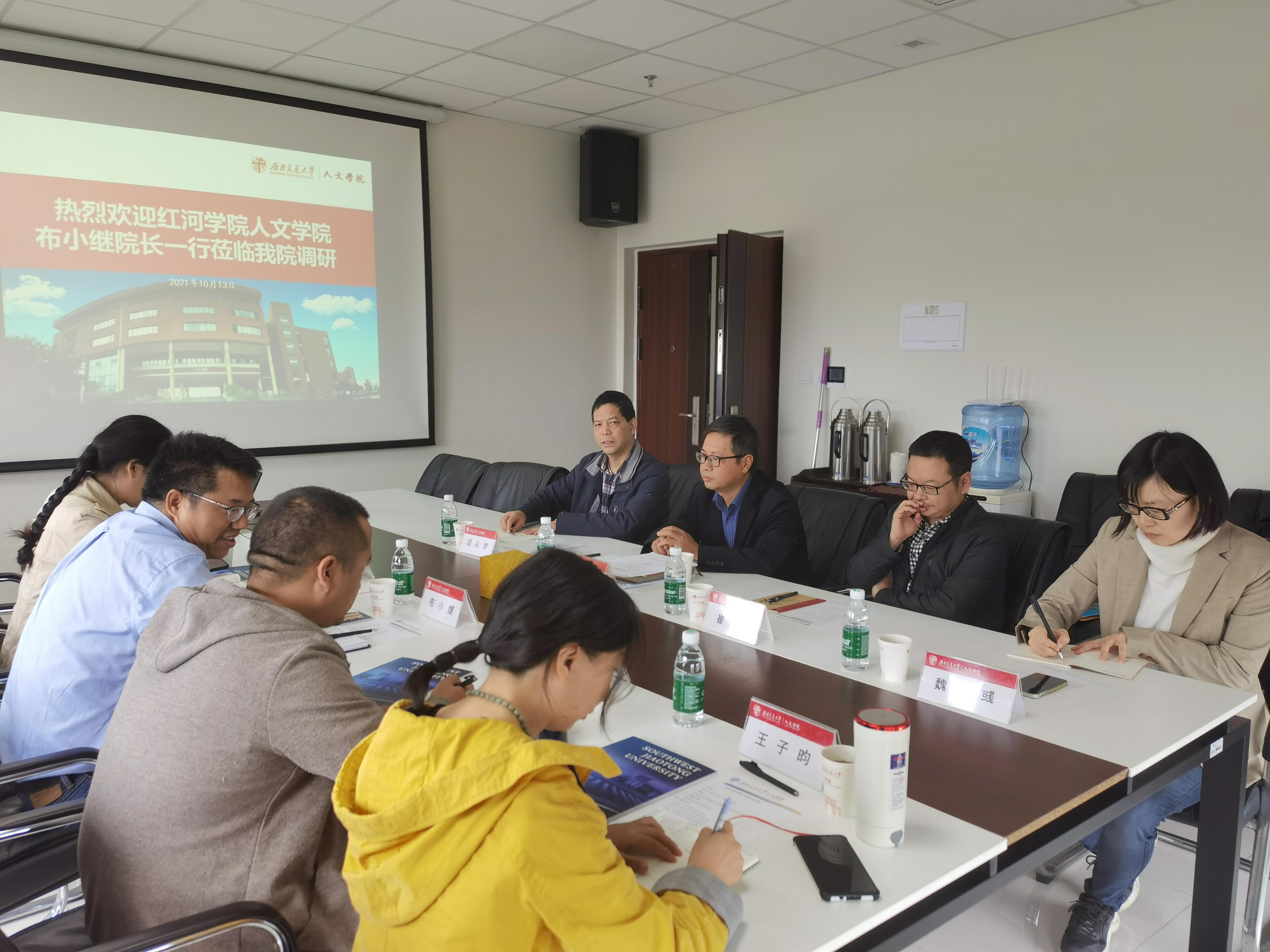 2021年10月13日下午2:30,红河学院木瓜视频 布小继院长一行四人到我院调研交流。学院沈如泉副院长、中文学科带头人段从学、哲学所所长崔罡、学科秘书魏若彧参加调研会。