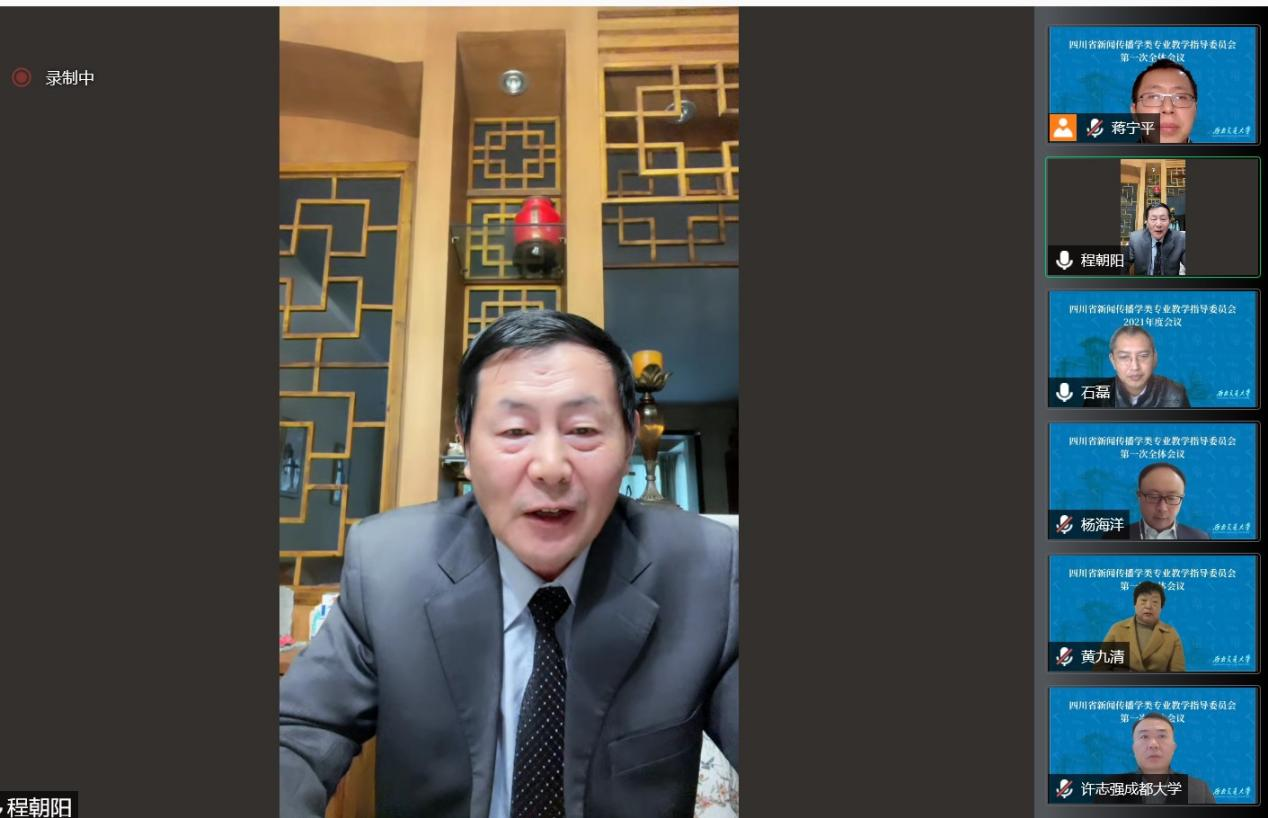 教务处崔凯处长通过录播视频形式致辞,四川省新闻工作者协会程朝阳副主席代表新闻界致辞。教育部新闻传播学教指委委员、四川省新闻传播教指委主任委员、木瓜视频