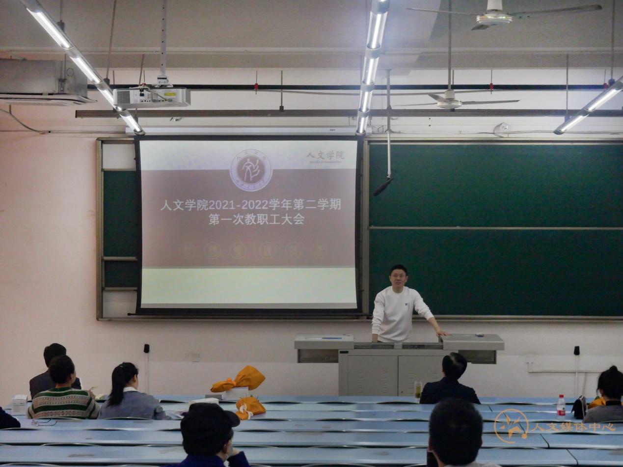 的院情和亟待发展的问题,刘院长介绍了2022年学院行政工作要点,包括学科建设、高层次人才引进、绩效分配政策调整等。在讲话的最后,刘院长号召老师们要同心同向同行,推动人文日新。