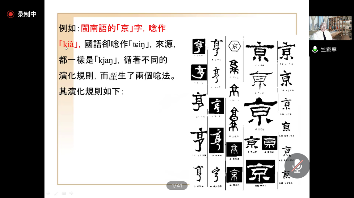 竺家宁教授从“谈谈声韵学知识的运用”引入,指出人类的语音时刻在变化,声韵学正是为了了解语音逐步演化的轨迹,并掌握其规律而设的。竺教授强调,声韵学是所有学习文史的人必须具备的基本知识。“从声韵学认识现代方言的血缘脉络”中,竺教授透过声韵学,讲解了中国各方言间亲疏远近的关系,并指出它们从古汉语中分化的时代。“声韵学与外来语”中,竺教授举出实例“天竺”、“突厥”等,比较了英语、土耳其语等语言,讲解了外来语的语音变化。