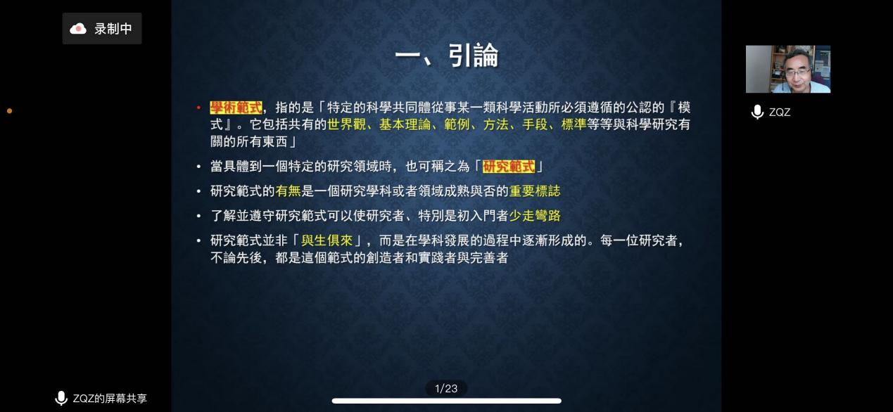 朱庆之教授从学术视角展开讲座主题,指出“学术范式”是特定的科学共同体从事某一类科学活动所必须遵循的公认的“模式”,它包括共有的世界观、基本理论、范例、方法、手段、标准等等与科学研究有关的所有东西。随后朱教授进一步阐述了学术范式的概念与特点,并且对“相对静止”和“与时俱进”作了辩证分析。