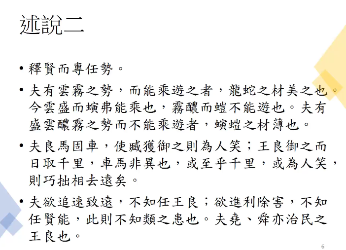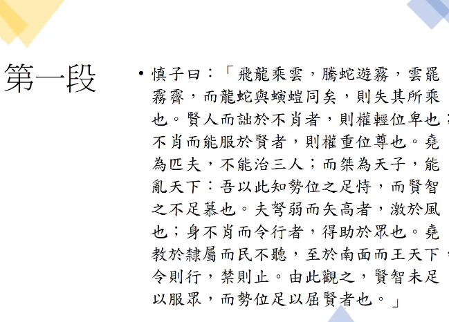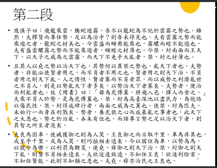 本次讲座以“语言逻辑的重要性”为主题,郭教授先为听众展示了《韩非子·难势》中的三段节选,内容清晰详尽,为我们理解《韩非子》的语言逻辑提供了详细的材料参考。