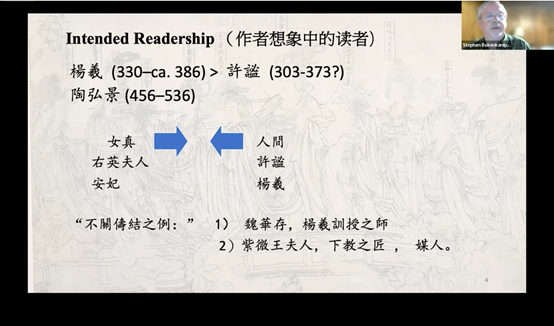 讲座开场,主持人刘婧瑜博士先介绍了柏夷教授及其近著A Fourth-Century Daoist Family: The Zhen'gao, or Declarations of the Perfected, Volume 1(《公元四世纪的一个道教世家——〈真诰〉英译第一卷》),随即介绍本场讲座主题。柏夷教授将在其翻译的基础上,进一步解读《真诰》中的有待无待歌诗,阐释其内涵及反映出的仙真人格。柏夷教授先感谢了主办方的邀请和主持人的介绍。他表示,《真诰》是世界文坛中的明珠,值得进一步深入讨论,他非常高兴可以有机会再一次考虑此前对这十一首真人辩论诗所作的翻译。