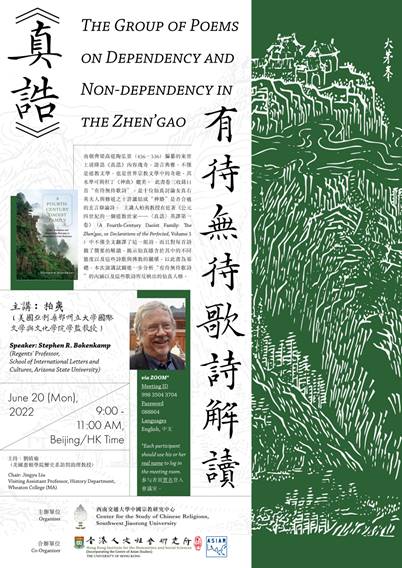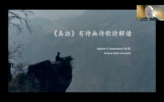 中国宗教研究中心与香港大学香港人文社会研究所联合邀请美国亚利桑那州立大学国际文学与文化学院学监教授柏夷(Stephen R. Bokenkamp)先生通过ZOOM视频会议室举行线上讲座,讲座主题为“《真诰》有待无待歌诗解读”。本次讲座由美国哈佛大学博士、惠顿学院历史系访问助理教授刘婧瑜女士主持,来自木瓜视频