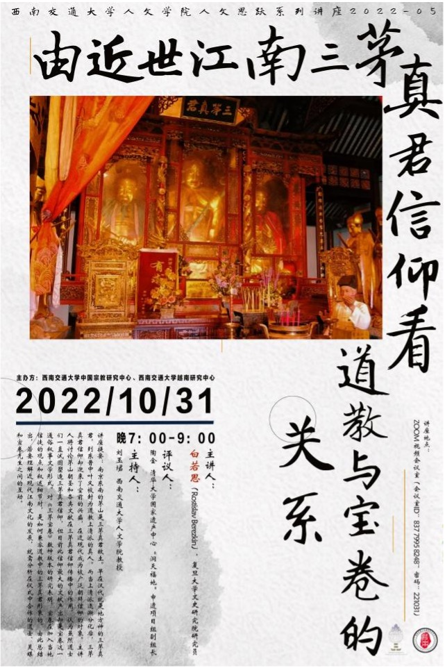 中国宗教研究中心与越南研究中心联合邀请复旦大学文史研究院研究员白若思(Rostislav Berezkin)先生通过ZOOM视频会议室做了一次线上讲座,讲座主题为“由近世江南三茅真君信仰看道教与宝卷的关系”。本次讲座由木瓜视频