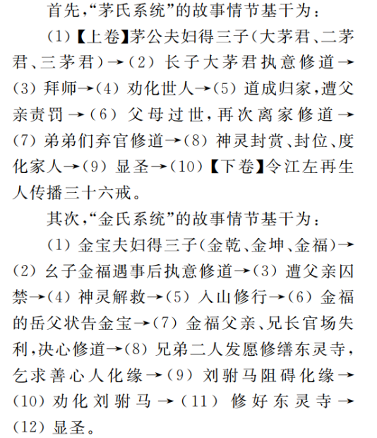 白若思老师搜集到了十种不同版本的《三茅宝卷》。河北省图书馆收藏的上海翼化堂同治十二年(1873)木刻本是已知最早的版本,但尚未得见。他搜集到的最早的版本是苏州元(玄)妙观得见斋光绪三年(1877)木刻本,题为《三茅真君宣化度世宝卷》,今存于上海图书馆及早稻田大学图书馆。虽然各种版本的《三茅宝卷》均与茅山进香活动有密切关系,但这些版本却可分为两大系统,其一是以三茅真君茅盈、茅固、茅衷三兄弟为主角的茅氏系统,如得见斋本,另一系统则是以金干、金坤、金福三兄弟为主角的金氏系统,如厦门大学藏同治十三年木刻本《三茅应化真君宝卷》。相较而言,茅氏系统基本沿袭了道教仙传中三茅真君的修仙故事,虽有进一步加工,但明显与道教关系密切。而金氏系统则更接近民间传说、小说等俗文学作品的情节。靖江地区流传的《三茅宝卷》基本沿袭金氏系统,但在其基础上又增加了很多故事情节。靖江《三茅宝卷》可以说是宝卷劝善、教化、娱乐三大功能(车锡伦先生提出)的鲜活例证。目前仍有待进一步研究的问题是:靖江当地在佛头间代代口传秘授的《三茅宝卷》,在一开始是否参考了清代的木刻本《三茅宝卷》。(两种不同系统《三茅宝卷》的故事情节可参考下图,引自陈姵瑄,《〈三茅宝卷〉的版本系统研究》,《中国典籍与文化》2021年第4期。而道教上清经派真人传记《太元真人东岳上卿司命真君传》中的故事情节基干为:⑴三茅真君家世族胄→⑵大茅君弃家修道→⑶大茅君自修六年后梦玉女指引,拜西城王君为师→⑷大茅君随王君拜见西王母,从二真受学明堂玄真之道→⑸大茅君辞师入恒山学儒俗之业后还家,遭父亲杖罚,杖断→⑹二君当官时得乡人百余人相送,大茅君告众人自己升举之日,邀请乡人参加→⑺大茅君升举日以法术大宴宾客,场面盛大更超送别二君之时→⑻第二日,大茅君离家暂治句曲,告宗族子弟以升举事劝二君修道→⑼中茅君、小茅君辞官修道,未得补益→⑽中、小茅君寻大茅君学道服食→⑾中、小茅君受紫素策文→⑿大茅君受封为“司命东卿上真君”→⒀大茅君与二弟诀别,与王君俱到赤城玉洞,二弟留治勾曲)